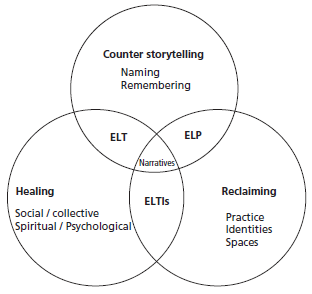 The rationale underpinning this theoretical section draws on Zabala’s (2016) decolonial strategies for education: counter storytelling, healing, and reclaiming. I choose to resort to the decolonial strategies Zabala constructs as “a particular kind of border thinking, a reenvisioning from the margins” (p. 2) to rethink what we understand as ELP and identity. With this framework, I aim to name hegemonic notions of ELP to position my own “geo-political and body-political location” (Grosfoguel, 2011, p. 5) as a teacher-researcher. Moreover, I attempt to explain how ELP intersects with ELTIs in the ELT field. Figure 1 illustrates how each element in it interlocks in a dynamic rather than linear relationship; “each is a dimension of the other” (Zabala, 2016, p. 2).