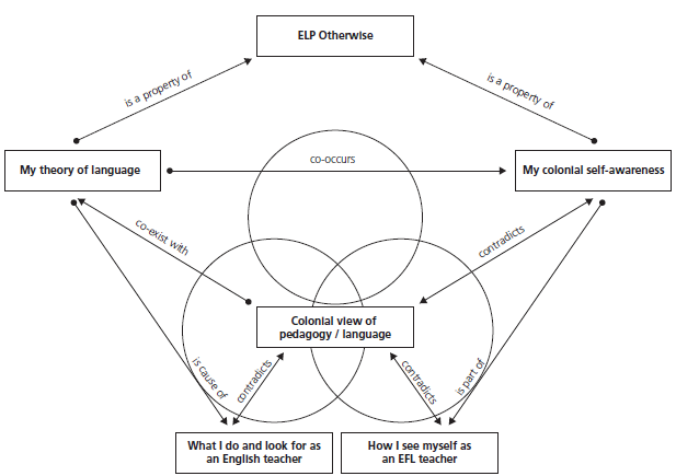 In this paper, I have stated that ELP is the result of a colonial narrative over teaching. Consequently, although intersectionality has been mainly used to foster theorization of the intersection of multiple inequalities in gender theory (Walby et al., 2012), I believe it can not only assist me in representing other positions, including those who do not exclusively experience an evident marginalization (Bauer, 2014), but it can also become “a tool for capturing actors’ socially-constituted everyday subjective meanings in the context of unequal structural positioning of social categories” (Atewologun & Mahalingam, 2018, p. 150) that, both epistemologically and ontologically, have been present in the ELT field.