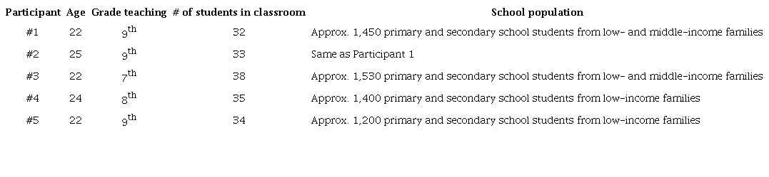 The participants were four women and one man, all in their twenties and in their 8th semester of the program where this study took place. They were taking a secondary education practicum course, after having already participated in the first elementary education practicum course. They were placed in four different mixed-sex, urban, public educational institutions, located in Florencia (southern Colombia). These institutions had an average of 800 secondary school teenage students from diverse religions, ethnic groups, and social classes, predominantly from low-income families. Purposive sampling (Kumar, 2011) was employed to select participants who also signed a consent form to be part of the study. Details regarding participants’ profiles and their school contexts can be found in Table 1.