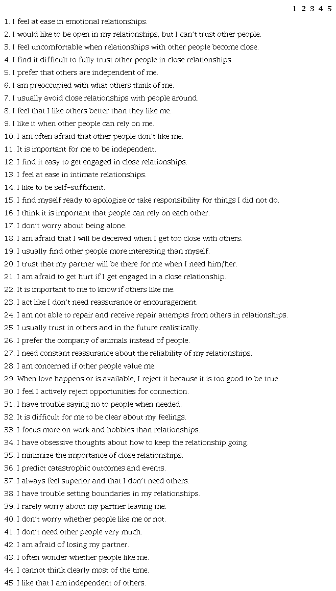 This questionnaire, which is based on Van Oudenhoven et al. (2003) and Poole Heller (2014), is designed to gather data about attachment styles of Iranian EFL teachers. The questionnaire consists of 45 items in which you have to carefully read each item and check what best describes you. The statements concern how you feel in emotionally intimate relationships and how you generally experience relationships. Your answers to the questions will be strictly confidential.