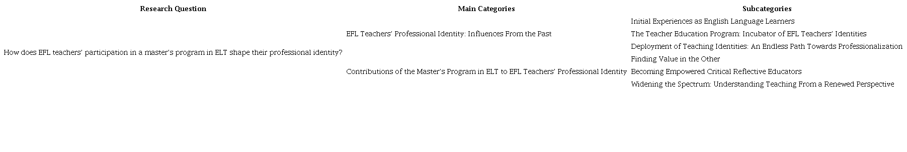 In this section, we present the results obtained from the analysis of the collected data aimed at exploring four EFL teachers’ identities trajectories prior to and after their participation in a master’s program. Two main categories emerged (see Table 1) which were paramount in understanding that identity construction is a dynamic process continuously developing from the experiences lived by the educator (even before becoming one) and is not limited to a particular event. Additionally, the categories show that postgraduate education promotes opportunities for further identity development, enabling teachers to reflect upon and think critically about their role in education.