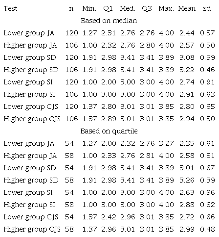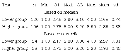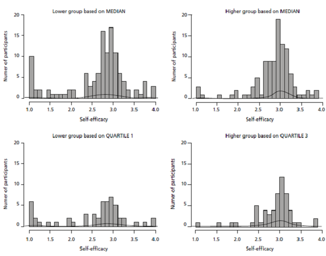 Table 3 shows that the means of self-efficacy for each scale section between the lower group and the higher group, based on both median and quartile, were different with some similarities except for mean and standard deviation. The next subsection presents the results of inferential statistical analysis to show whether these differences are significant.