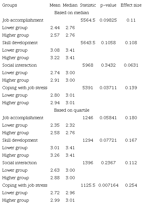 The results of Mann Whitney U test for each part of the teacher self-efficacy scale show that the hypotheses were rejected for teacher self-efficacy of coping with job stress at the significance level of 0.05 for both group classification (median and quartile), and mastery experience, or job accomplishment, at the significance level of 0.1. Since the significance level used in this research was 0.05, the significance level for mastery experience was treated with caution. The effect sizes were greater for the group determined using the quartile than those using the median.