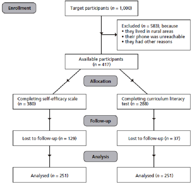 The target participants for this research were 1,000 high school English teachers (about 50% of all high school English teachers) from Aceh, the westernmost province of Indonesia. The participants who completed the test were 288 (29% of the target participants), and 380 (38%) target participants completed the self-efficacy scale. Twenty-five percent of the target population (251 participants) completed both assessments: 216 women (86%) and 35 men (14%). The detailed figures for each region of the province are presented in Table 1, and the CONSORT participant flowchart in Figure 1.