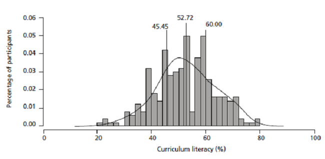 Figure 2 shows that the data were evenly distributed, where the number of participants who obtained a lower score were approximately similar to those who obtained higher scores. The density line (curved line) is plotted to show the distribution of the data. The median of the data was 52.72 out of 100. For the purpose of the first analysis, the participants were split using the median as the cutoff point, which resulted in 120 participants with lower curriculum literacy and 106 participants with higher curriculum literacy. In the second analysis, the participants were divided into two groups where the first group consisted of teachers whose scores were lower than 70% of all teachers (54 teachers) and the second group consisted of teachers whose scores were higher than 75% of all teachers (58 teachers).