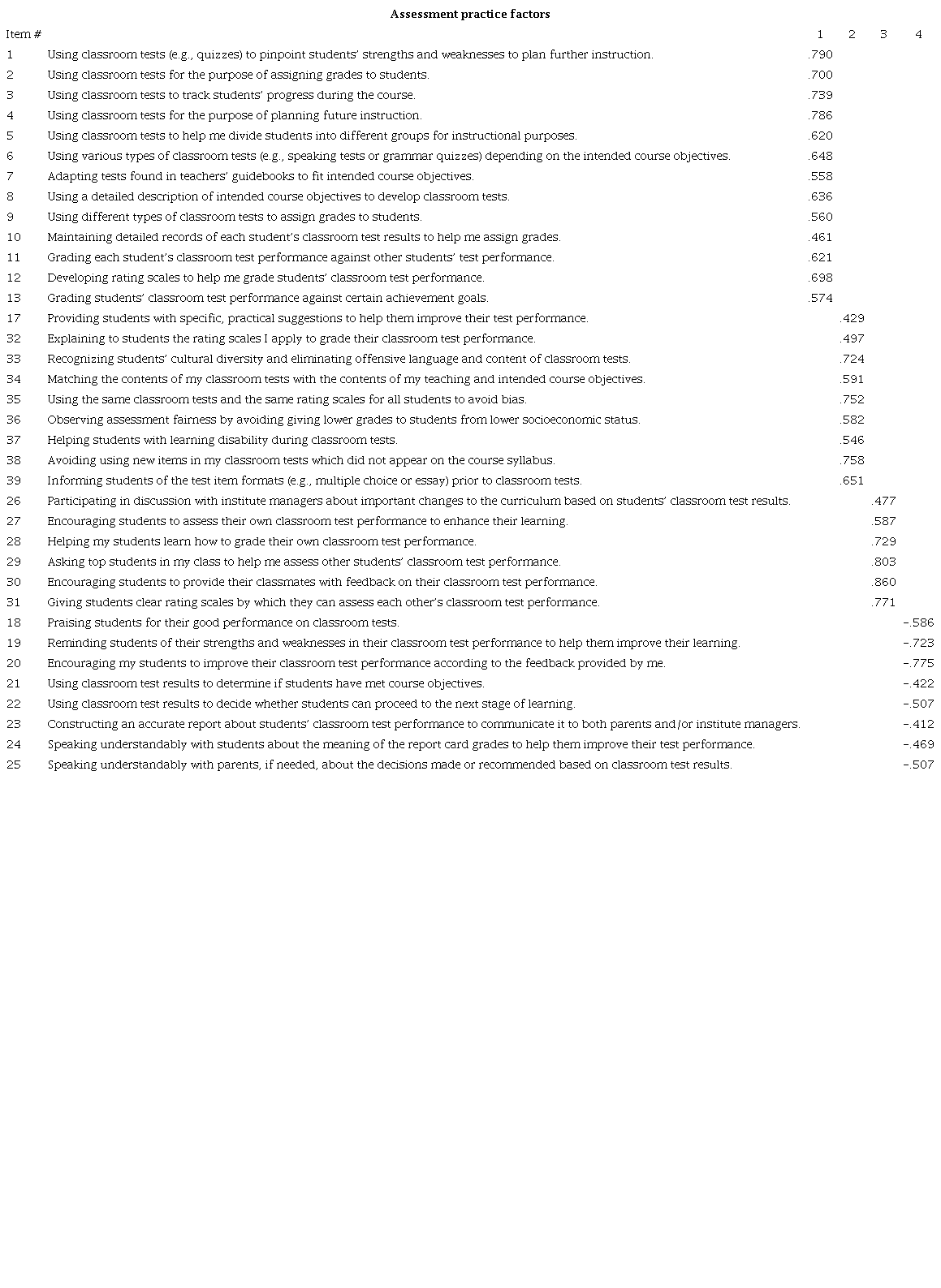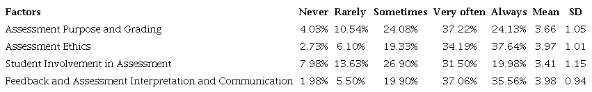 As for assessment practice items, those that clustered around the same factors (bolded items) in the pattern matrix presented in Table 4 suggested that factor one, comprising 13 items, represented “Assessment Purpose and Grading.” It elicits the frequency of the use of classroom tests to track students’ progress during the course, to plan future instruction, and to assign grades to students. Factor two, consisting of 9 items, represented “Assessment Ethics.” Factor two items inquire into observing assessment fairness and avoiding assessment bias in classroom tests. Factor three, comprising 6 items, implies “Student Involvement in Assessment.” It explores the frequency of assisting students to learn how to grade their own and their peers’ classroom test performance. Finally, factor four, with 8 items, refers to “Feedback and Assessment Interpretation and Communication.” The items elicit the frequency of reminding students of their strengths and weaknesses in their classroom test performance and of using classroom test results for decision-making purposes.