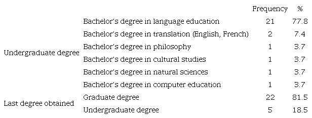The participants of this study were 27 English language teachers, five program coordinators, and seven regional campus coordinators. Most English teachers have a bachelor’s degree in language education (77.8%). There are also a few professionals with bachelor’s degrees in translation (7.4%), philosophy (3.7%), natural sciences (3.7%), cultural studies (3.7%), and computer education (3.7%). Most of the teachers hold a graduate degree (81.5%). Table 1 summarizes this information.