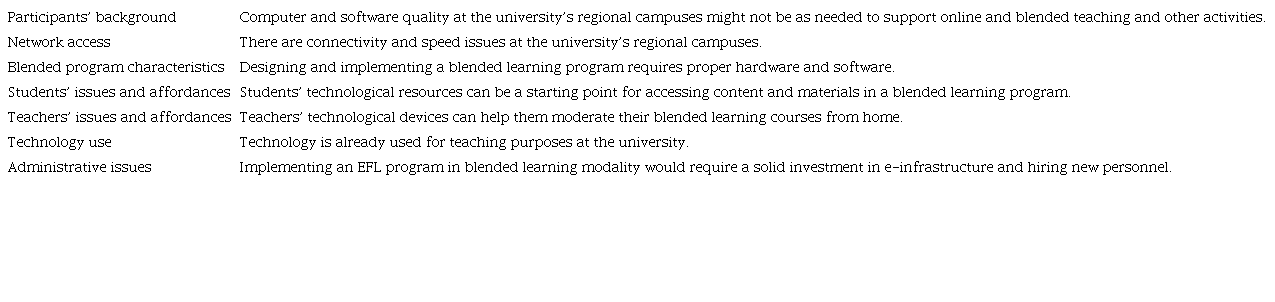 Besides, findings suggest that implementing an EFL program in a blended learning modality requires a solid investment in e-infrastructure and hiring new personnel. While e-infrastructure would require proper hardware, software, and connectivity improvements, hiring new personnel should accompany this investment to support teachers, administrators, and students. This investment in e-infrastructure could be carried out gradually, in any case, because teachers have devices and access to the internet at home, which might help pilot the program, whereas the institution further develops its e-infrastructure.