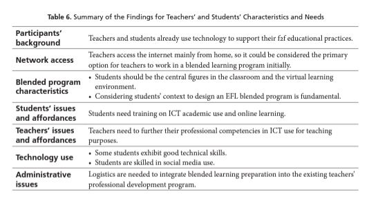 Regarding the second category, the teachers interviewed agreed on the importance of students’ contextual conditions when designing an EFL blended program. Such conditions include internet access, technological tools availability, and online learning training. One of the teachers asserted: