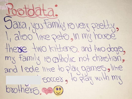 Dialogue journals in class allowed students to tell their activities to others and react to the differences between one area and the other, to find meeting points and characteristics that make them unique. Furthermore, students became aware of their cultural richness, their traditions, and the joy of sharing them with other people, as Figure 3 shows.