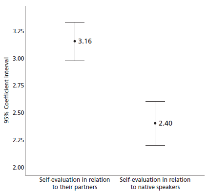 The participants’ ages ranged from 19 to 32 years (M = 22.13, SD = 2.32), and most were women (74.2%). Only 32.9% reported taking extra English classes and 8.6% living in an English-speaking country. Half of the participants mentioned that they never or hardly ever use English as a medium of communication outside the university classroom, while 38.5 % use it sometimes. For 77.4% of the participants, reaching a high English proficiency level is very important. Regarding their English overall proficiency self-evaluation, on a 1-5 scale, the mean value was 3.16 compared to their peers, but it was 2.40 compared to native speakers (see Figure 1).