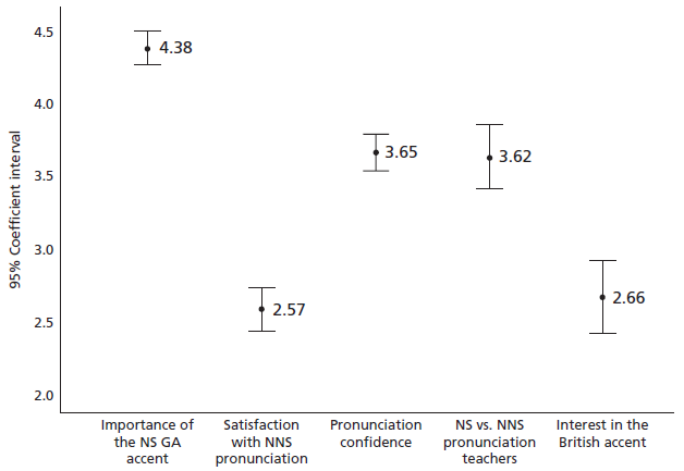 An error bar chart was created to determine significant differences related to the variability of the dimensions. As shown in Figure 2, with a confidence interval of 95%, three groups of dimensions are differentiated significantly. The first group corresponds to Importance of the native-speaker GA accent with the highest mean (4.38). The second group comprises two factors: Pronunciation confidence (3.65) and Native- vs. nonnative-speaker pronunciation teachers (3.62). The last group encompasses Satisfaction with NNS pronunciation (2.57) and Interest in the British accent (2.66).