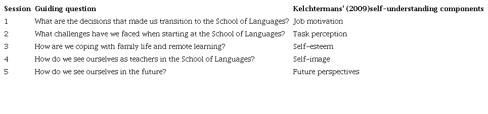 We collected data during five sessions via Google Meet following Kelchtermans’ (2009) five components of self-understanding—self-image, self-esteem, job motivation, task perception, and future perspectives—to develop our guiding questions. Recorded group sessions were transcribed and coded. In addition, we created artifacts for each session that included poems, essays, and artwork. Each of us chose what to create based on what experience we wanted to discuss. Table 1 offers an overview of our sessions.