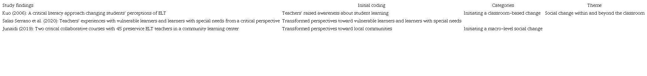 Even though the studies in our dataset show that ELT teachers could become more critical in perspective and more transformative in their instructional practices, we found that teachers’ expected role to become social change leaders was confined to their immediate classrooms. This situation did not result from language teachers not wanting to promote large-scale societal change or engage in leadership or activism. Rather, their broader contexts did not allow them to do so.