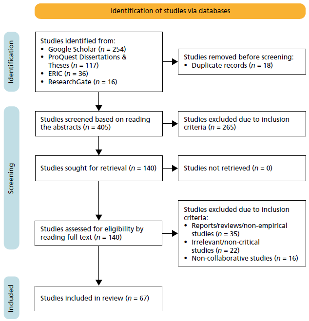 As there is a growing interest in using research evidence to inform educational practices, systematic reviews serve as secondary research, conveying a broad and synthesized view of a particular research topic, which could otherwise not be possible by single studies (Newman & Gough, 2020). Hence, in this study, we conducted a systematic review to analyze and synthesize previously conducted critical collaborative PD research and develop new perspectives for the future of critical collaborative PD (Nye et al., 2016). We used the Preferred Reporting Items for Systematic Reviews and Meta-Analyses (PRISMA) flow chart diagram (Figure 1) to portray the study selection process (Haddaway et al., 2022).