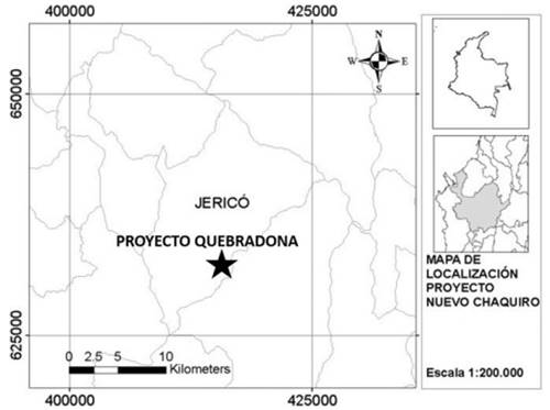 El proyecto Quebradona de la empresa Minera Quebradona Colombia S.A (Joint venture entre AngloGold Ashanti (AGA) y B2Gold), se encuentra localizado en el suroeste del departamento de Antioquia (Fig. 1), sobre el flanco oriental de la cordillera occidental, entre los municipios de Jericó y Támesis. El objetivo principal de exploración del proyecto es Nuevo Chaquiro, el cual es un depósito tipo Pórfido de Cobre, con grandes toneladas y baja ley con Oro, Molibdeno y Plata [30].