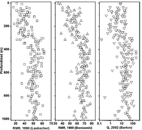 Inicialmente se realizó un análisis general del macizo rocoso con respecto a la profundidad sin tener en cuenta las alteraciones hidrotermales dominantes presentes (Fig. 2). En esta evaluación se observa una diferencia en todos los sistemas de clasificación, en los valores entre 0 - 300 m y los valores entre 300 y 1000 m; además, en el primer rango entre 0 y 300 m de profundidad, el puntaje del índice Q, presentan una elevada dispersión entre 0.1 y 40 puntos.
