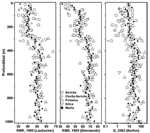 Para explicar la diferencia en la calidad del macizo rocoso en profundidad, se realiza una clasificación del mismo teniendo en cuenta las alteraciones hidrotermales (Fig. 3). De ésta clasificación, se observa que los primeros 300 metros de las perforaciones muestran dos alteraciones hidrotermales dominantes correspondientes a las alteraciones de mediana temperatura Sericita y Clorita-Sericita, con valores promedio de 40 puntos para el RMR de Laubscher, 54 puntos para el RMR de Bieniawski, y 7 puntos para el Q de Barton. Después de los 300 metros hay un aumento de la calidad del macizo debido a presencia dominante de las alteraciones correspondientes a Sílica y Potásica con valores promedio de 51 puntos para el RMR de Laubscher, 69 puntos para el RMR de Bieniawski, y 37 puntos para el Q de Barton.