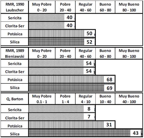 Teniendo en cuenta dicha correlación cualitativa, se realiza un comparativo entre los valores medios encontrados en cada alteración hidrotermal en los tres sistemas de clasificación considerados en este estudio (Fig. 4). En dicha evaluación, las alteraciones presentan un comportamiento similar para todos los sistemas de clasificación, las alteraciones Sericitica y Clorita-Sericítica, clasifican la calidad de macizo rocoso entre Pobre y Regular, mientras que las alteraciones Potásica y Sílica, clasifican el macizo rocoso entre Regular y Muy bueno.