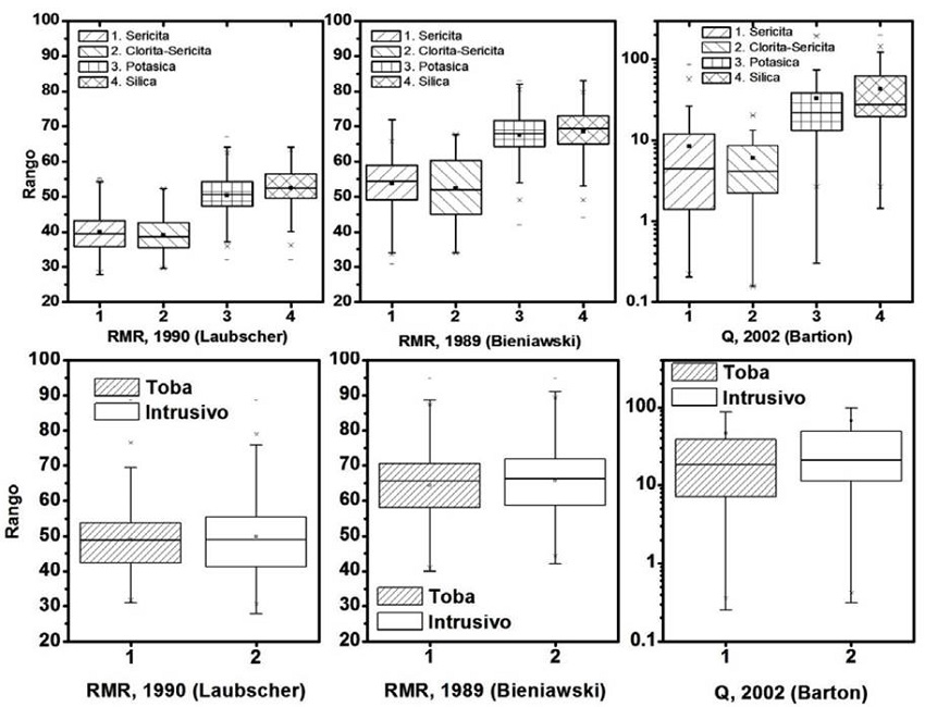 Teniendo en cuenta que la diferencia de la calidad del macizo está relacionada con la presencia de diferentes alteraciones hidrotermales; se realiza un análisis de valores medios, diagramas box plots y, comparativo estadístico entre cada sistema de clasificación entre las alteraciones hidrotermales dominantes.