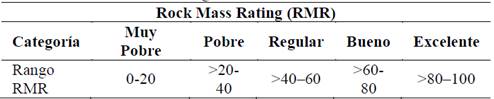 En esta investigación, solo se considera el valor de RMR modificado por Laubscher para la clasificación del macizo rocoso, es decir, no se tiene en cuenta el ajuste para determinar el MRMR. Laubscher clasifica la calidad del macizo rocoso en las mismas 5 categorías propuestas por Bieniawski (Tabla 1).