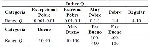 El sistema Q de Barton, presenta una escala de calificación logarítmica entre 0.001 y 1000. Grimstad y Barton [15], presentan una actualización en la carta de soporte, la cual, además, correlaciona las categorías de calidad de macizo rocoso entre RMR de Bieniawski y el índice Q de Barton.