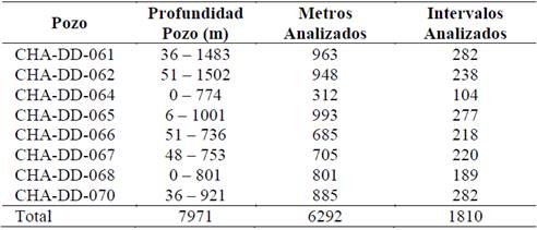 A final de 2014 y durante todo el año 2015, sobre ocho perforaciones corazonadas diamantinas (Tabla 3), se obtuvo información geotécnica por medio de una metodología de logueo basada en Dempers, 2010 [31], modificada por AngloGold Ashanti; con el fin de clasificar el macizo rocoso por las metodologías anteriormente descritas. Las perforaciones tienen profundidades que varían entre 700 m y 1500 m, aproximadamente. Sin embargo, para el análisis presentado solo se consideraron los datos geotécnicos correspondientes a intervalos de 3 m y a una profundidad máxima de 1000 m. En total, se analizaron 6292 m lineales con información geotécnica, con diámetros de núcleo que oscilan entre 71 mm y 56 mm.