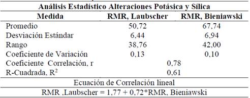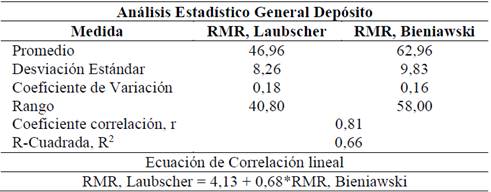 Al realizar un análisis comparativo estadístico entre los valores de RMR de Laubscher y RMR de Bieniawski, incluyendo, medidas de tendencia central, medidas de variabilidad y medidas de relacionamiento (Tabla 4) se muestra que: