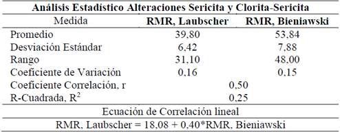 Al igual que en las alteraciones de mediana temperatura, los valores de RMR de Laubscher son considerablemente menores a los valores del RMR Bieniawski.