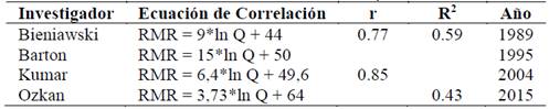 La comparación entre los sistemas RMR de Bieniawski y Q de Barton, se observó que de las correlaciones históricas, la más cercana es la propuesta por Kumar [33] en 2004. Dicha correlación, tiene un R2 = 53%, ligeramente menor al determinado en esta investigación. Esta situación permite interpretar que no es sano la determinación del macizo rocoso por medio de correlaciones históricas; debido a que las tendencias de estas, están distantes a la nube de puntos. Por tal motivo, es aconsejable definir una correlación propia en cada depósito, teniendo en cuenta que el depósito tipo pórfido se encuentra afectado por la presencia de alteraciones hidrotermales. De forma similar, la evaluación entre la metodología RMR de Laubscher y Q de Barton. Destaca que ninguna de las correlaciones históricas se aproxima a la nube de puntos del depósito.
