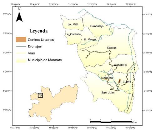 Marmato está localizado en el flanco oriental de la cordillera occidental y en la vertiente occidental del río Cauca (Imagen 1). Este municipio es la puerta de entrada al Departamento de Caldas por el Noroccidente y se encuentra topográficamente en la zona occidental del relieve conocido como el macizo de los mellizos.