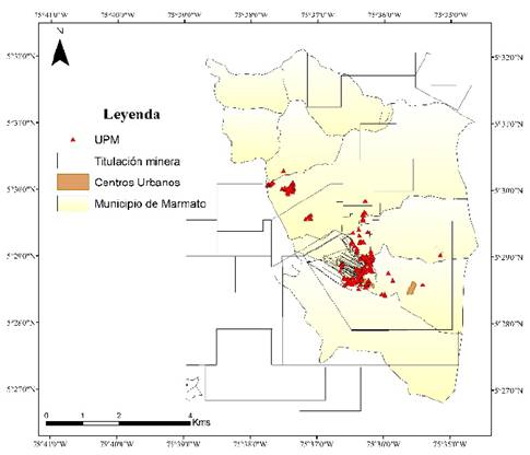 En la Imagen 2 se ilustra la localización de los títulos mineros que tiene el municipio de Marmato y la ubicación de las UPM que se analizaron en este proyecto.