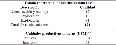 Según la información suministrada por la ANM a diciembre de 2015 en cuanto a titulación minera en el municipio de Marmato, se reporta un total de 121 títulos mineros, de los cuales la Autoridad Minera Departamental a septiembre de 2011, develó que la cantidad de Unidades Productivas Mineras (UPM) así como del estado contractual de los títulos mineros (Tabla 1) corresponden a un total 334 UPM y 73 minas en condición de inactividad, localizadas todas ellas sobre los títulos mineros en mención [10].