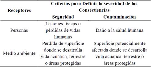 Para estimar la Severidad de las Consecuencias (SC) sobre los potenciales receptores cuando un escenario de riesgo se vuelve efectivo es relativamente complejo, además que éstos; debido a su procedencia, están íntimamente relacionados con los receptores (personas, medio ambiente y actividad minera); por lo tanto, fue necesario definir criterios que permitieran categorizar y parametrizar la evaluación de este parámetro (Tabla 5).