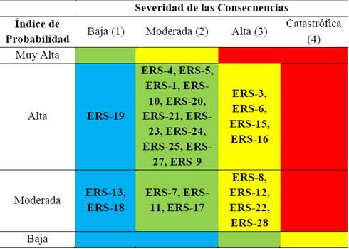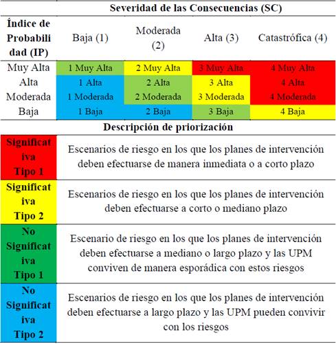 La matriz de riesgos se formuló mediante la combinación de los factores Índice de Probabilidad de ocurrencia (IP) y Severidad de las consecuencias (SC) con el propósito de determinar los niveles de importancia del escenario de riesgo valorado. La priorización es catalogada como SIGNIFICATIVOS (celdas de color rojo y amarillo) y NO SIGNIFICATIVOS (celdas de color verde y azul) (Tabla 6).