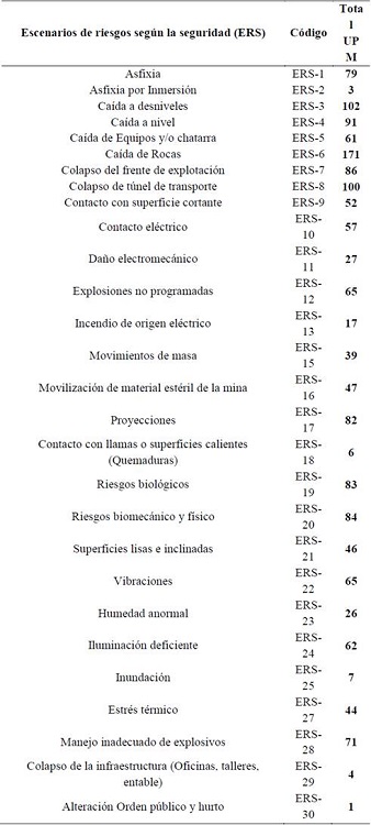 Los escenarios de riesgos según la seguridad (ERS) identificados en las UPM del municipio de Marmato más recurrentes son: caída a desnivel (ERS-3) evidenciado en el 43% (102) de las UPM y localizado en mayor instancia en el sector de Cien pesos, caída de rocas (ERS-6) evidenciado en el 71% (171) de las UPM y localizado en los sectores de La Llorona y Cien pesos, y colapso de túnel de transporte (ERS-8) comprobado en el 42% (100) de las UPM y localizado en mayor proporción en el sector de La Llorona, todo esto debido a los escasos protocolos de seguridad, las precarias condiciones del sostenimiento, mantenimiento y falta de manejo geotécnico del macizo rocoso.
