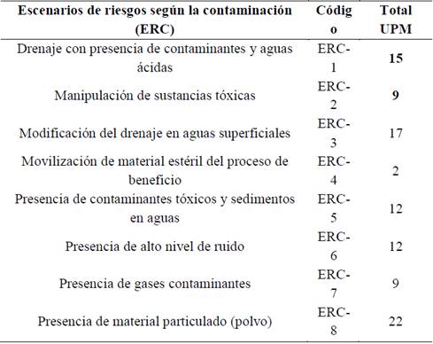 Los escenarios de riesgos según la contaminación (ERC) identificados en las UPM más frecuentes son: presencia de material particulado (polvo) (ERC-8) y drenaje con presencia de contaminantes y aguas (ERC-1). El primero de ellos se presentó en el 79% (22) de las UPM en el que se identificó este escenario de riesgo, localizado principalmente en el sector de Cien pesos, mientras que el segundo se evidenció en el 72% (17) de las UPM y localizado en mayor proporción en los sectores de La Llorona y Echandia.