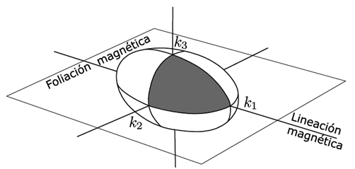 La Fig. 1 muestra esquemáticamente el octante y el elipsoide del tensor de anisotropía de susceptibilidad magnética, donde el eje mayor es la línea del alineamiento magnético y el plano cuyo vector ortogonal es la dirección propia menor del tensor corresponde a la foliación magnética.