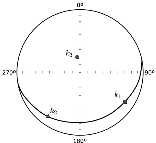 La Fig. 2 muestra esquemáticamente los tres puntos en la proyección estereográfica equiangular que representan las tres orientaciones propias del tensor de anisotropía de la susceptibilidad magnética. Estos tres puntos tienen una particularidad gráfica en esta proyección que está relacionada al tensor: los puntos que representan la orientación propia de mayor e intermedia definen un plano (en la proyección) cuyo polo corresponde al punto que representa la orientación propia menor. Esto se debe a la ortogonalidad de las direcciones propias de un tensor de segundo orden y es una de las propiedades bases dentro del desarrollo estadístico presentado más adelante.