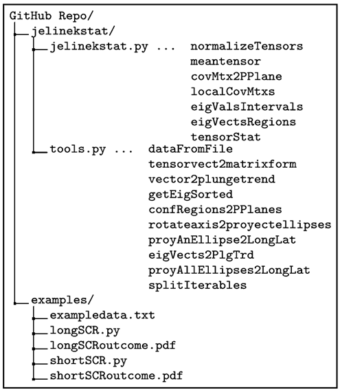 La división de la aplicación en dos módulos se realiza por la necesidad de separar las funciones asociadas a las ecuaciones presentadas por Jelínek en [1] para el desarrollo del proceso estadístico (jelinekstat.py) y el grupo de herramientas que soportan a la metodología para su completo desarrollo tales como operaciones del algebra lineal, transformaciones de sistemas coordenados y operaciones sobre la red estereográfica (tools.py). El esquema de la Fig. 3 muestra la organización del directorio del SA.
