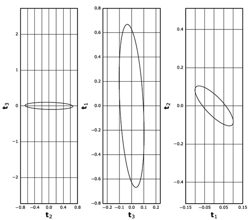 para un nivel de confiabilidad dado, siendo en el segundo caso una región que define la forma de una elipse que se localiza ortogonalmente al respectivo vector propio.