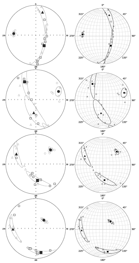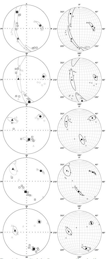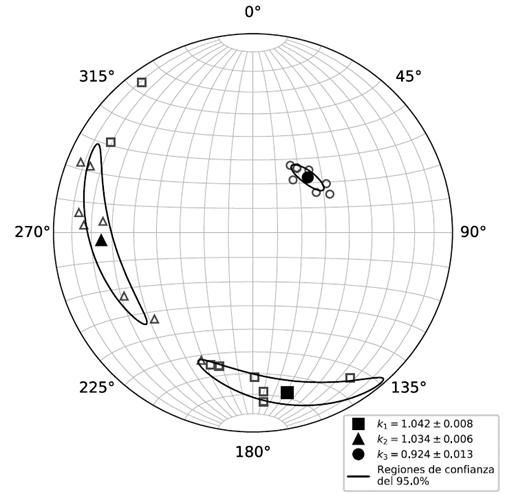 El segundo resultado gráfico corresponde a una figura en proyección esférica equiárea que contiene las orientaciones principales del tensor promedio y las elipses de sus regiones de confianza proyectadas en este sistema; también proyecta las orientaciones principales de cada una de las medidas de la muestra con la que se estimó el tensor promedio. En la gráfica, el símbolo que representa el vector principal mayor es un cuadrado, el que representan el vector principal intermedio es un triángulo, y el que representa el menor es un círculo. Si el símbolo está relleno de color negro está representando el promedio, mientras que si no está relleno es únicamente el dato de entrada. Ejemplo de este resultado se observa en la Fig. 5.