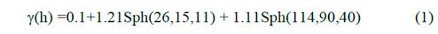 El semivariograma experimental y el modelo ajustado son mostrados en la Fig. 6. Todos los semivariogramas fueron calculados con el sistema automatizado GEMCOM. Se observa una anisotropía geométrica. El ajuste del semivariograma experimental fue realizado por un modelo imbricado, compuesto por dos modelos esféricos con un efecto de pepita. La expresión analística de modelo de variabiliad y correlación especial obtenida se muestra en la siguiente ecuación (Ec. 1):