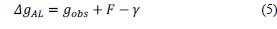 Para obtener la correspondiente anomalía de aire libre (Δg AL), de acuerdo con [2], se utiliza el valor de la gravedad observada (𝑔OBS) más la respectiva reducción de aire libre (𝐹) menos la gravedad normal (γ), expresada en la ec. (5).
