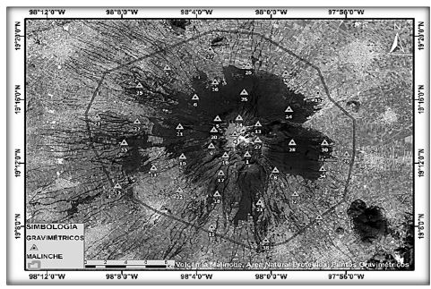 Para el análisis gravimétrico se han determinado 39 puntos gravimétricos sobre la Malinche como se muestra en la Fig. 3, teniendo de ellos su latitud y longitud y altura elipsoidal, con la cual se ha transformado a altura ortométrica con software libre de INEGI (https://www.inegi.org.mx/app/geo2/alturasgeoidales/) de este modo se han aplicado los modelos matemáticos propuestos, para calcular la aceleración de la gravedad normal, así mismo se ha hecho uso del modelo EIGEN-6C4 para obtener la gravedad observada sobre los puntos determinados (los valores que se utilizan están basados en la cuarta versión del modelo EIGEN-6C4, la versión más actual del modelo, por lo que en versiones posteriores los valores pueden presentar variación alguna), posteriormente se han calculado las reducciones de aire libre y Bouguer, para calcular sus respectivas gravedades y así las anomalías. Por practicidad se programó una hoja de cálculo, utilizando la base de datos del modelo IEGEN-6C4 para el cálculo automático de cada punto.