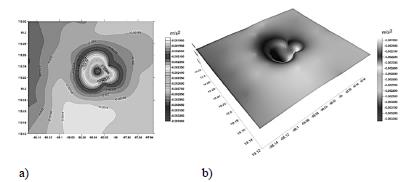 La anomalía de aire libre, muestra variación en el sentido vertical con un promedio de los 39 puntos de 0.001297652 m/s2. La anomalía de Bouguer, se presenta negativa en todos los puntos en promedio de -0.002101469 m/s2 dichas anomalías han sido modeladas en Surfer, como se muestra en la Fig. 5 y 6.