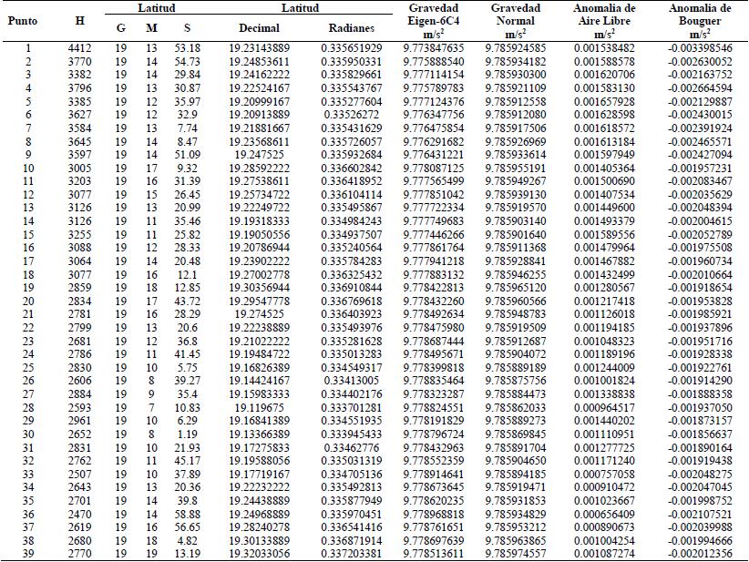 Aplicando los modelos matemáticos, anteriormente mencionados, se han obtenido las anomalías de aire libre y Bouguer sobre el volcán la Malinche, como se muestra en la Tabla 1.