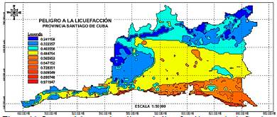 El nivel de estudio alcanzado en la provincia hace posible realizar evaluaciones sobre la licuefacción como fenómeno geológico secundario, identificando los mayores potenciales en la zona costera cercana al límite sur de la placa Norteamericana, donde se encuentran sedimentos aluviales poco consolidados en que además, el nivel freático se encuentra a unos pocos centímetros de profundidad en las desembocaduras de los ríos y casi toda la zona baja de los alrededores de la bahía de Santiago de Cuba; esto significa que las construcciones y obras de infraestructura situadas en el entorno tienen un alto grado de vulnerabilidad ante la ocurrencia de la licuefacción del terreno. Por otro lado, se considera como peligro moderado a la licuefacción su incidencia en zonas bajas adyacentes a la cuenca del río Cauto, que cubre la parte meridional de la provincia, sobre todo para sismos de magnitudes superiores a los 7 grados en la escala Richter [12]. (Fig. 11 y Fig. 12)