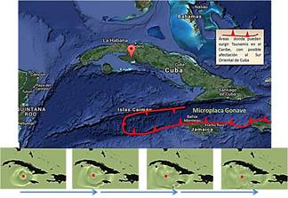 Se plantea además, que existen probabilidades de ocurrencia de tsunamis en el área del Caribe que podrían afectar a las localidades situadas en las proximidades de las zonas costeras de la provincia Santiago de Cuba, localizando sus focos generadores a lo largo del sistema de fallas BartlettCaimán, los que estarían originados, fundamentalmente, por terremotos o deslizamientos submarinos en el lado sur del sistema, desde Islas Caimán, pasando por el norte de Jamaica, hasta la costa norte de Cabo Haitiano, o en la parte norte hacia las proximidades de Islas Caimán. Todas estas estimaciones se suceden en los límites de la microplaca Gonave, donde también tienen lugar complejos procesos geológicos de hundimiento en el centro y formación de la Fosa Barttlet, corrimiento y apertura, además de presión de límite de placas en sus extremos este y oeste, razones que en conjunto favorecen la posible ocurrencia de terremotos submarinos y tsunamis de moderada magnitud (Fig. 14) [12]. Estos elementos expuestos complican la situación de peligro sísmico de la provincia Santiago de Cuba, al poseer varias comunidades en zonas bajas próximas a las costas.