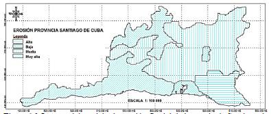 La erosión constituye uno los principales peligros geológicos de la provincia Santiago de Cuba, valorándose como elevada debido a la intensidad de los factores condicionantes de la erosión, entre estos, intensa capacidad erosiva de los suelos, la presencia de rocas vulcanógeno sedimentarias medianamente compactadas con una potencia considerable, sobre todo hacia el sur, un elevado factor del relieve manifestado por sus pronunciados ángulos de inclinación y longitud de las pendientes, y poco desarrollo de la vegetación [19]. En la provincia predomina la erosión que se genera durante las temporadas de lluvias (Fig. 16).